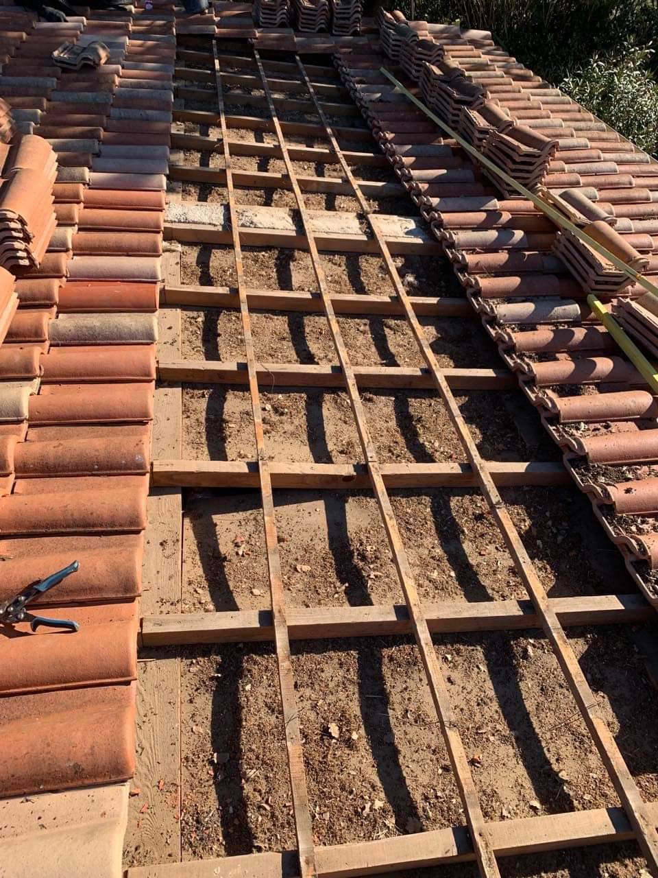 BCH a alors déposé les tuiles du client de manière à avoir accès aux anciens liteauxgalbés pour pouvoir les évacuer et remplacer ces derniers par des nouveaux liteauxtraités.